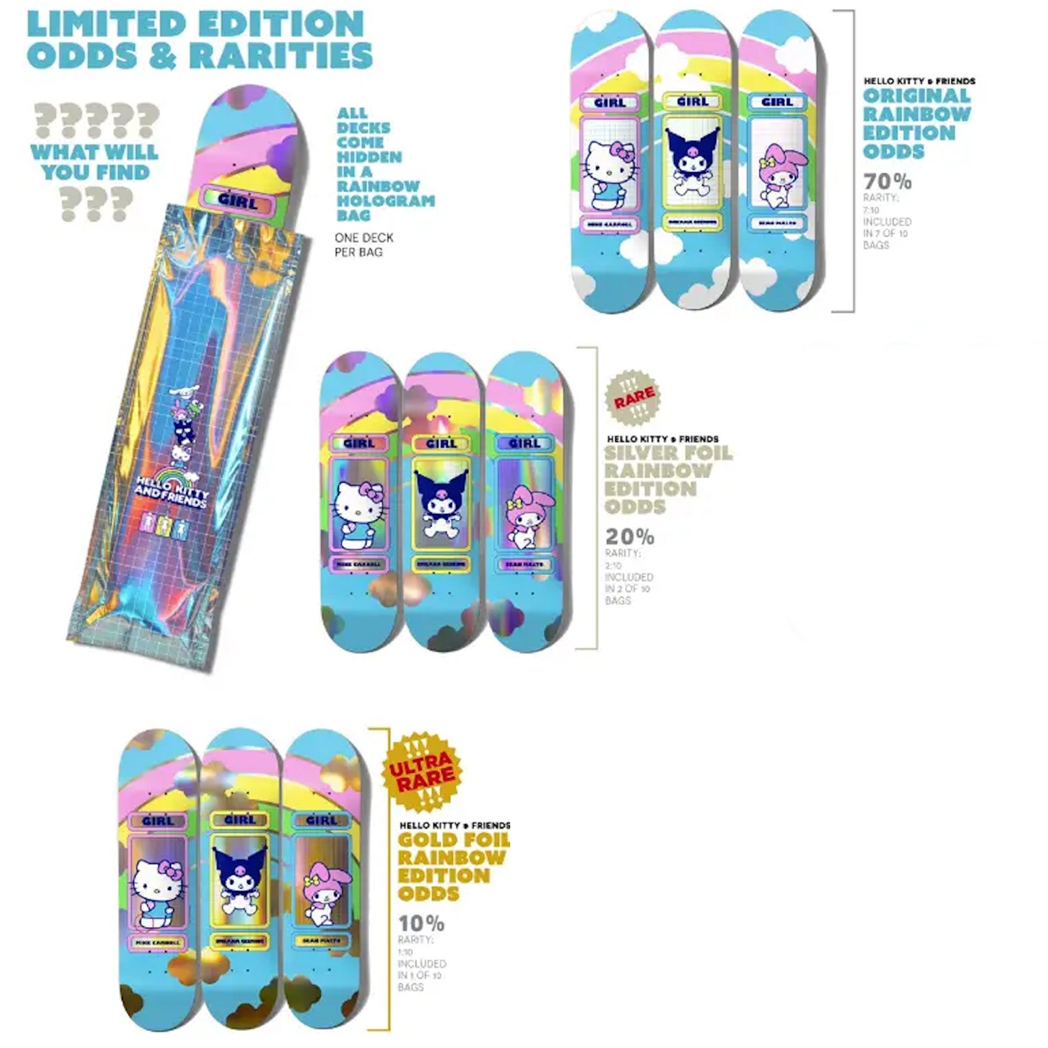Each board comes sealed in rainbow hologram shrink wrapped bag, keeping the specific rarity hidden until you reveal one of the three unique variations.