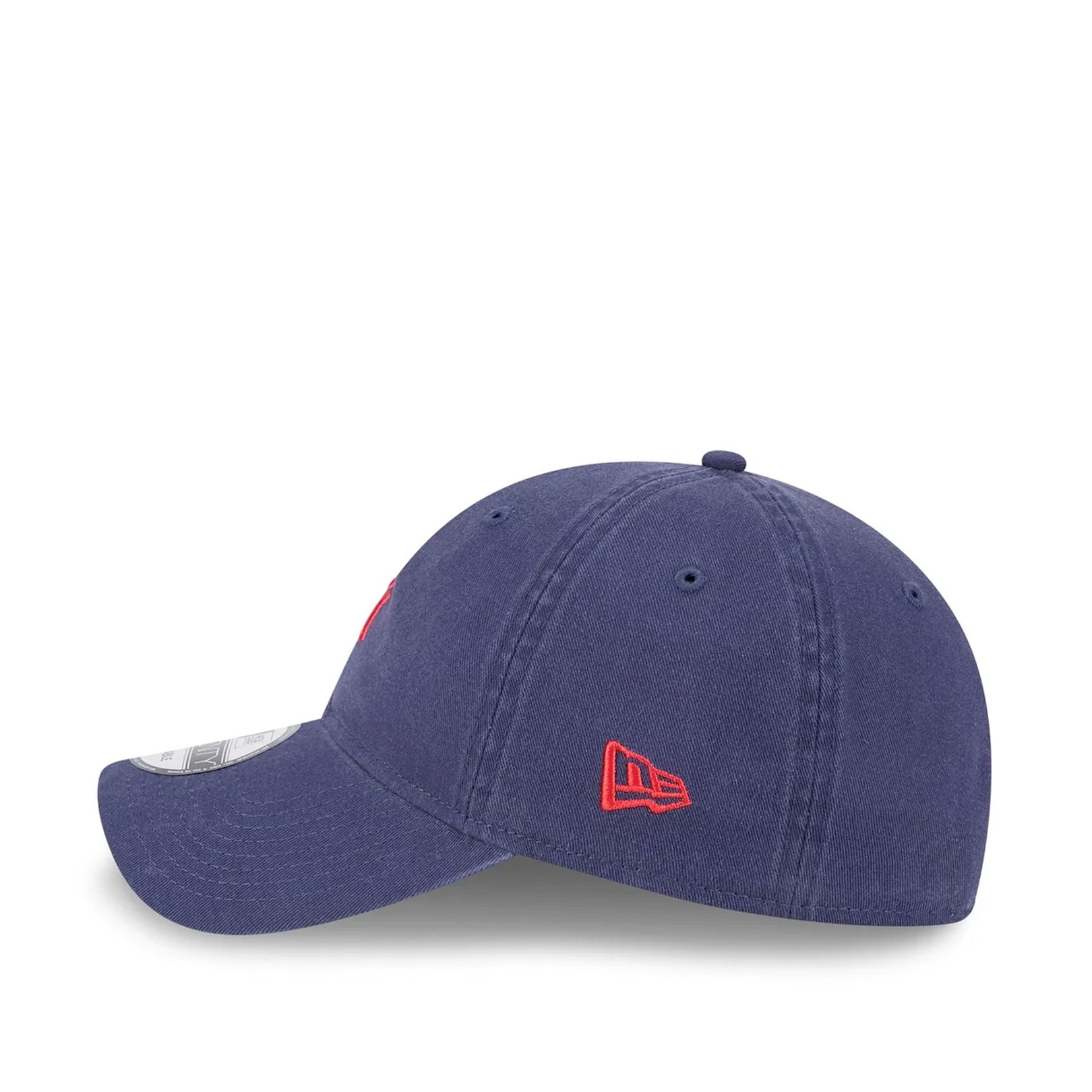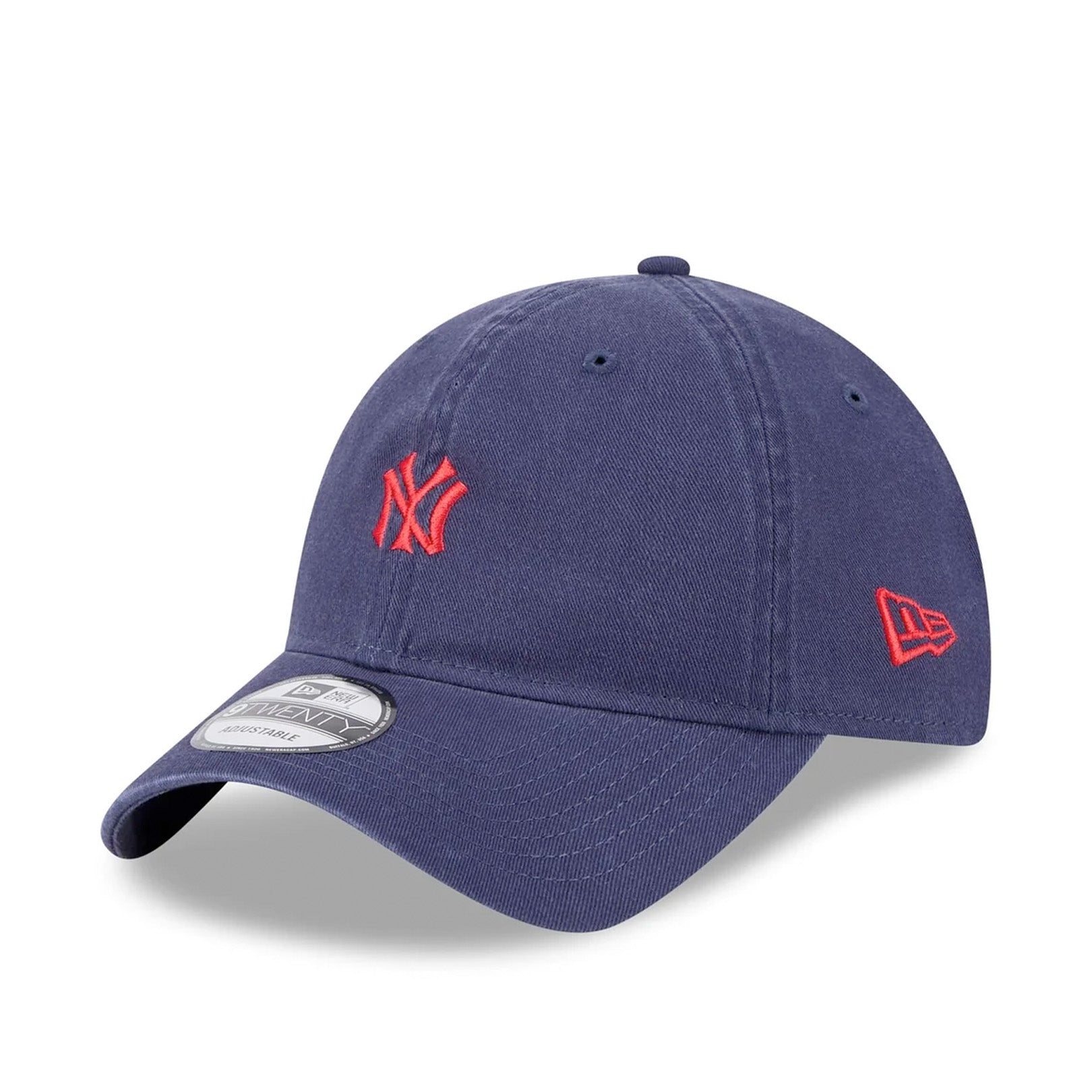 The New York Yankees Festive Mini 9TWENTY Cloth Strap features an embroidered flat retro Yankees logo on a low-profile unstructured cotton crown, contrast NE flag logo on the left, and at the back an adjustable cloth strap and d-ring enclosure.