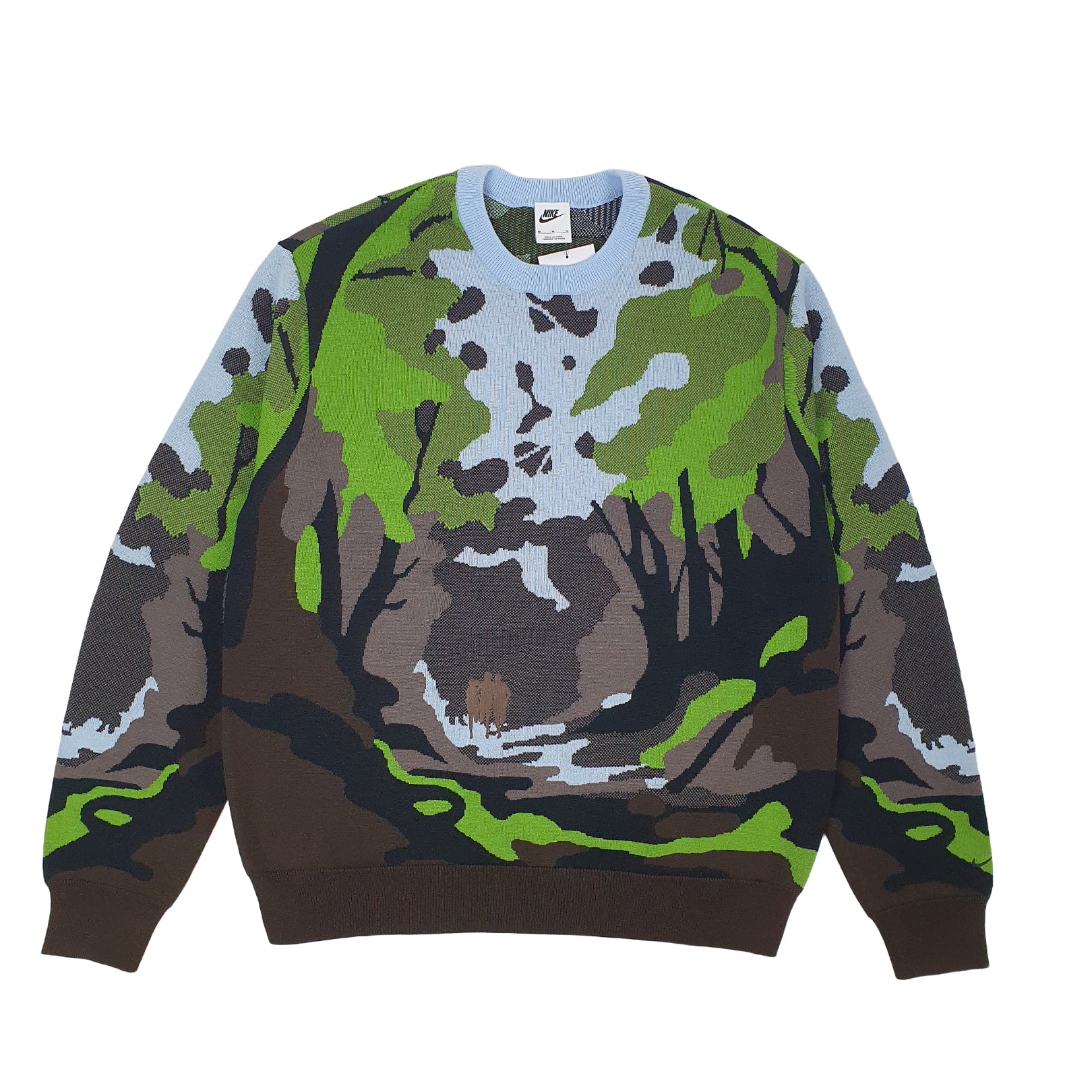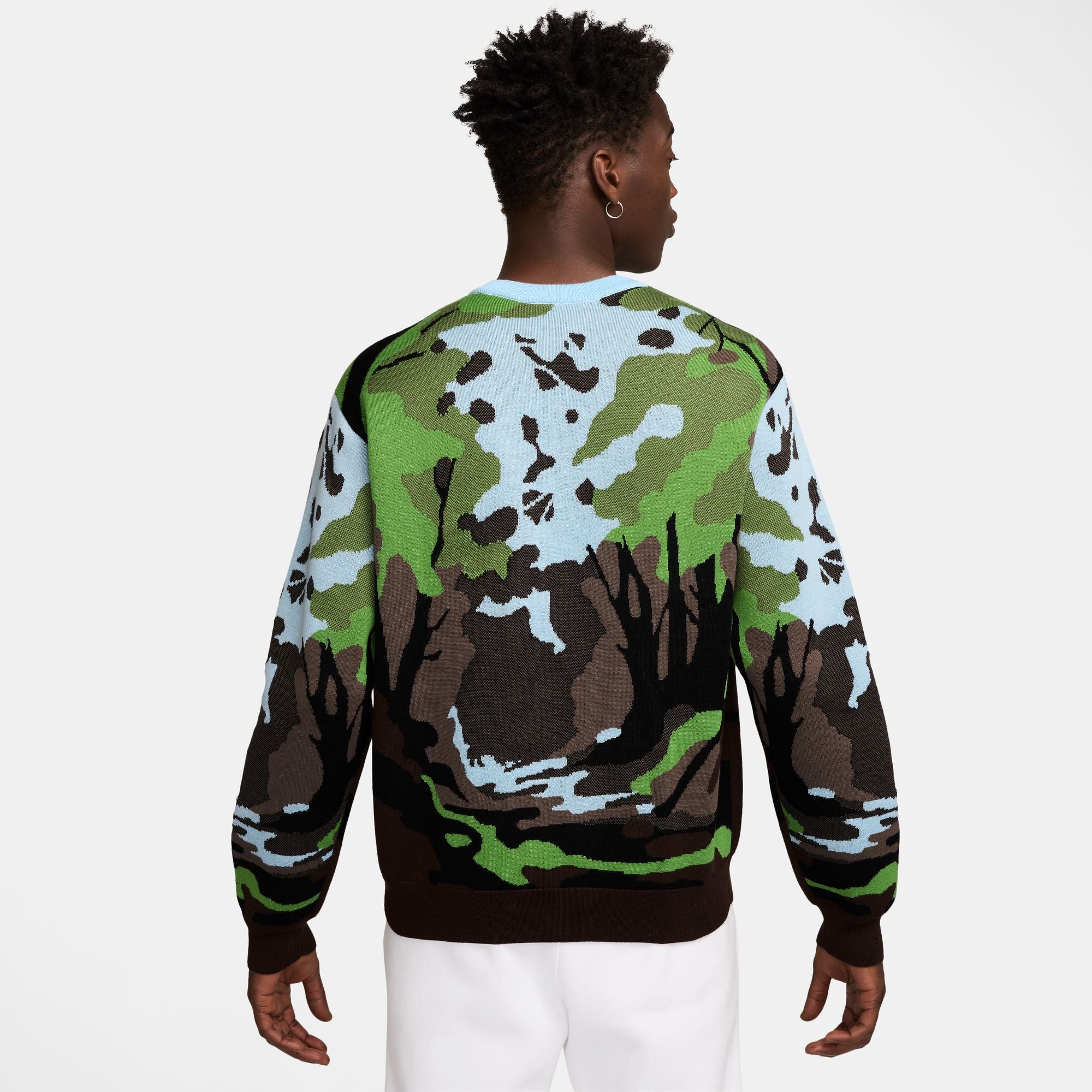 This sweater brings the outdoors to your everyday. The soft knit design depicts runners on Hollister Trail, a 1.4 mile runners loop just outside of Nike Campus in Beaverton, OR. Its loose fit feels roomy through the body.